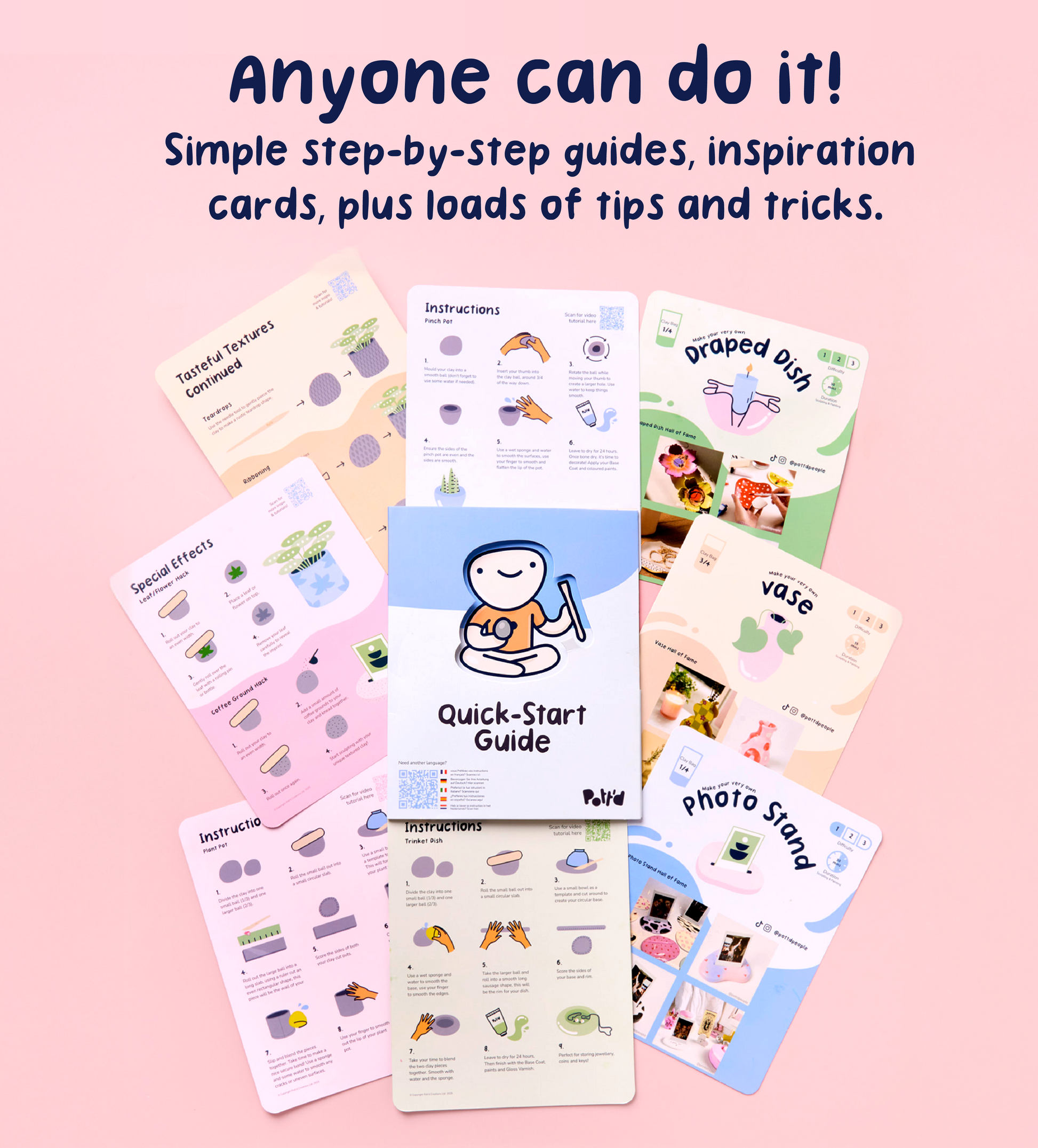 📝 1 x Pott’d quick-start guide with step-by-step instructions, and inspiration cards to create a whole bunch of creative pottery