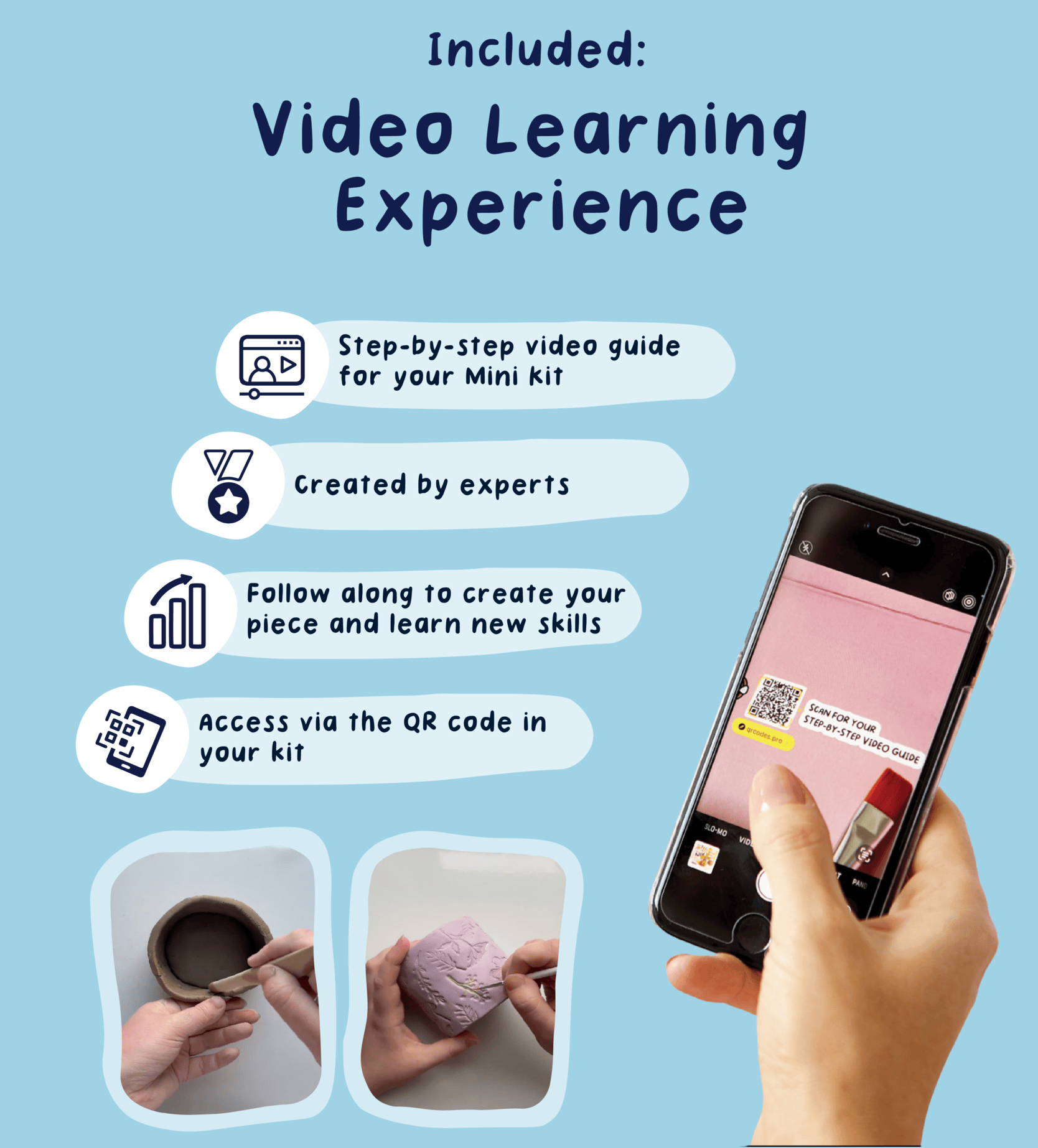 This kit is well put together for sure. Boxed well it has bags of clay, sealed and ready to use. You get scrapers and paints etc and varnish.Although this kit makes bread type things with tea lights, it can be used to make anything.The gripe here is no instructions! Scan the QR code for tutorials. As I dont use a smart phone ( I have a life) that will be difficult. I hate the assumption that a code can be used by all. There are some tiny font guides on the box but in the lid there is a big "Scan the QR code" but the frame has no code!Look. Its a good quality set for sure, but at £34 it needs a printed colour guide. Plain and simple.5***** otherwise.